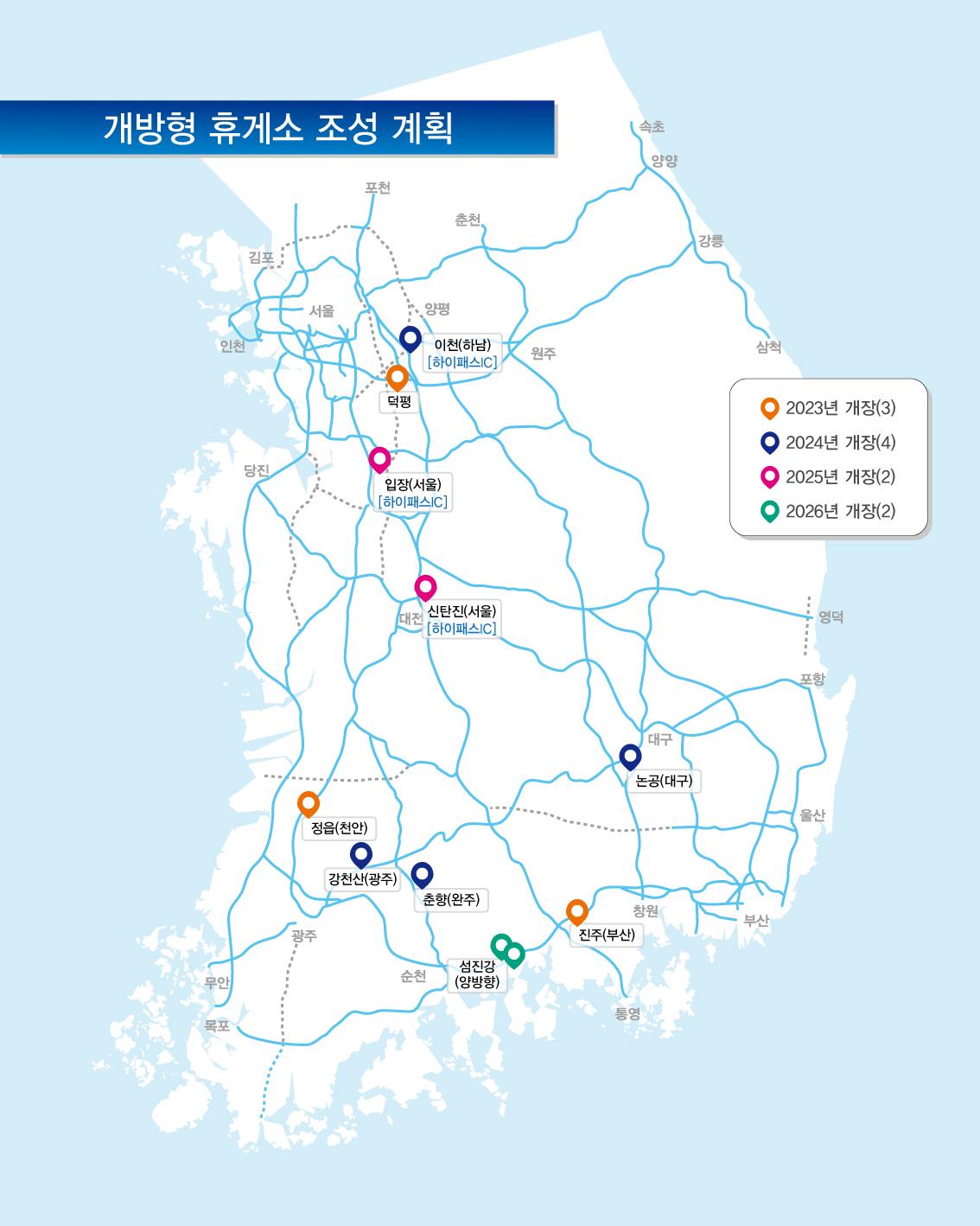 올해는 지자체와 협의를 마친 정읍, 진주, 덕평 휴게소 등 3곳을 우선 개장한다. 이어 내년에는 이천·논공·강천산·춘향 휴게소, 2025년 신탄진·입장 휴게소, 2026년 섬진강 휴게소(양방향) 등 총 11곳으로 확대된다.