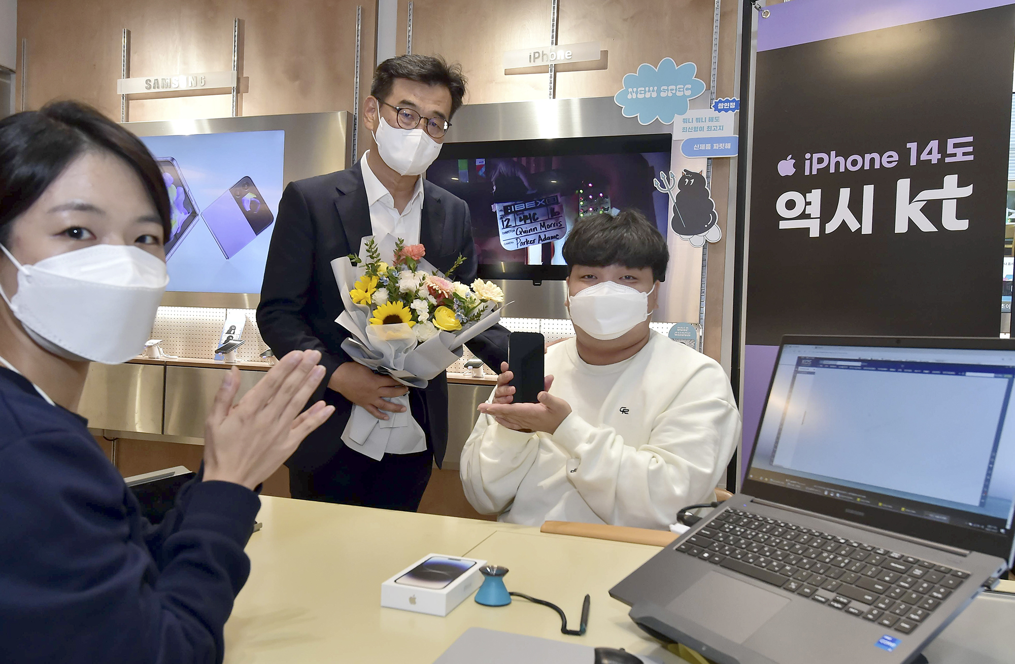 KT는 7일 오전 서울 홍대입구역 프리미엄 통신 매장 ‘홍대 애드샵 플러스(Add Shop+)’에서 iPhone 14 1호 개통 행사를 진행했다고 밝혔다.