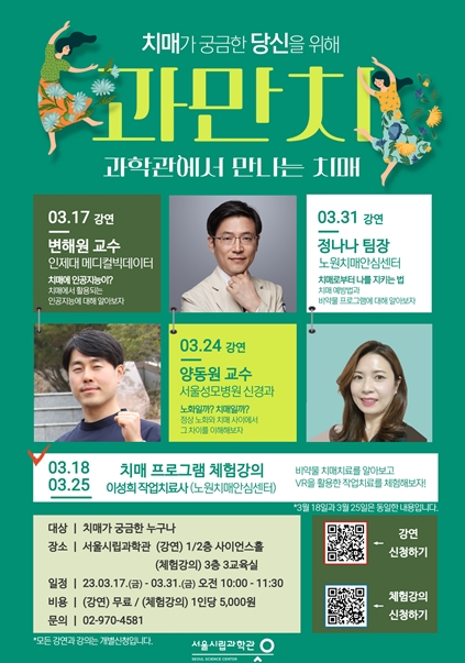 ‘과만치’(과학관에서 만나는 치매)프로그램은 치매에 관심 있는 성인을 대상으로 3월 17일부터 3월 31일까지 매주 금요일과 토요일 오전 10시에 90분간 진행된다. 전문가 강연은 무료로 진행되고, 가상현실(VR)기기를 활용하는 체험교육은 1인당 5,000원이다. 신청은 서울시공공서비스예약 시스템에서 접수할 수 있다.