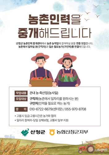 농촌 일손이 필요한 농가와 농작업 참여를 희망하는 구직자는 산청군농촌인력중개센터나 농인력중개플랫폼에서 신청하면 된다.