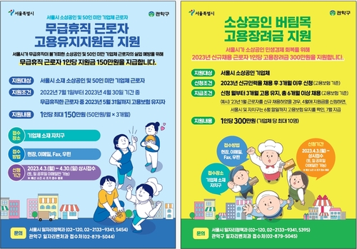 서울 관악구가 경기침체로 어려움을 겪고 있는 무급휴직 근로자와 소상공인의 생활 안정을 위해 '무급휴직 근로자 고용유지지원금'과 '소상공인 버팀목 고용장려금'을 지급한다.