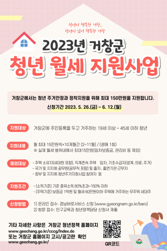 경남 거창군은 청년의 주거비 부담 완화와 정착을 돕기 위해 2023년 청년 월세 지원사업 신청을 이달 26일부터 내달 12일까지 18일간 신청받는다.