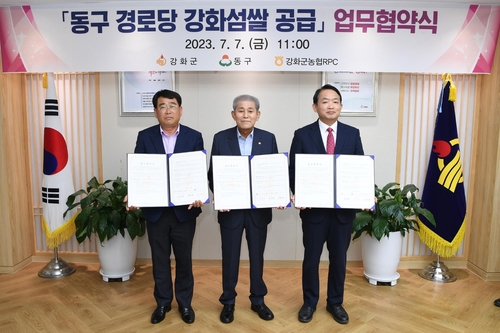 협약식에는 유천호 강화군수, 김찬진 동구청장, 김영윤 강화군농협쌀공동사업법인 대표가 참석했으며, 이달부터 동구 경로당 39개소에 강화섬쌀 4.6톤이 공급된다.