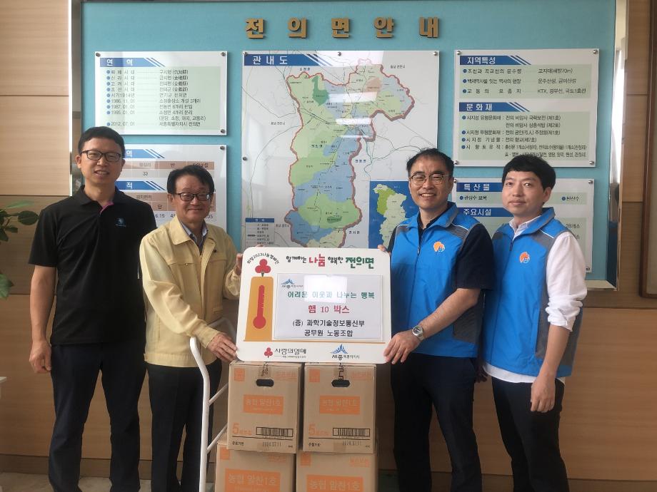 과학기술정보통신부노동조합이 지난 17일 전의면 행정복지센터를 찾아 수해피해 이웃 등을 위해 사용해달라며 햄 10상자를 전달했다.