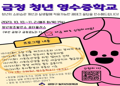 부산시 금정구는 청년의 올바른 소비 습관 및 재테크 가치관을 형성해 경제적인 자립 지원을 위해 10월10일∼11월2일까지 '2023 금정 청년 영수증학교'를 운영한다고 밝혔다.