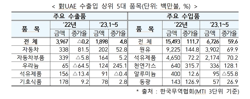 대표적으로 우리가 UAE에 수출하는 주력 품목인 자동차·자동차 부품, 냉장고 등 전기·전자 제품, 원동기, 합성수지 등의 관세가 철폐된다. 최근 빠르게 성장하는 하이브리드차와 전기차 등 친환경차 시장이 개방되는 만큼 UAE와 FTA를 체결하지 않은 다른 경쟁국 대비 시장 선점 효과를 누릴 것으로 기대된다.