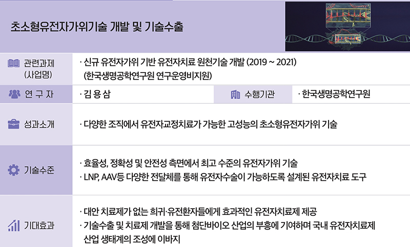 ‘초소형유전자가위기술 개발 및 기술수출(김용삼, 한국생명공학연구원)’은 다양한 조직에서 유전자교정치료가 가능한 고성능의 초소형유전자가위 기술을 개발했다.