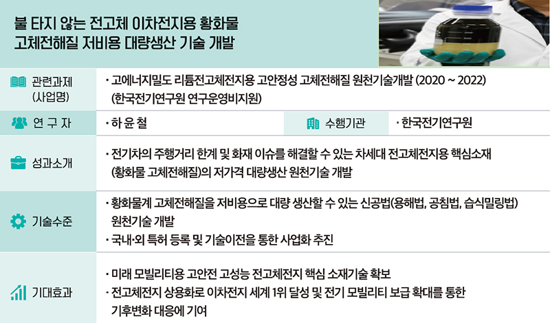 ‘불 타지 않는 전고체 이차전지용 황화물계 고체전해질 저비용 대량생산 기술 개발(하윤철, 한국전기연구원)’은 차세대 전고체전지용 핵심소재(황화물 고체전해질)의 저가격 대량생산 원천기술을 개발한 것이다.
