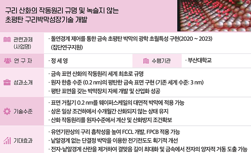 ‘구리 산화의 작동원리 규명 및 녹슬지 않는 초평탄 구리박막성장기술 개발(정세영, 부산대학교)’은 구리가 산화되는 원인을 실험과 이론을 통해 세계 최초로 규명했다.