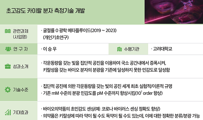 ‘초고감도 카이랄 분자 측정기술 개발(이승우, 고려대학교)’은 의약학 분야의 60~70%를 차지하는 카이랄성 분자를 육안으로도 손쉽게 확인할 수 있는 획기적인 기술이다.