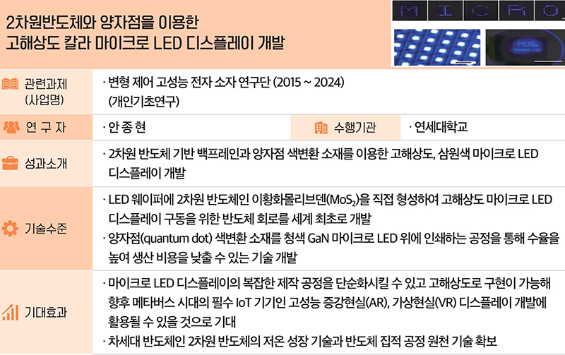 ‘2차원 반도체와 양자점을 이용한 고해상도 칼라 마이크로 LED 디스플레이 개발(안종현, 연세대학교)은 정보·전자 분야의 우수성과로 선정됐다.