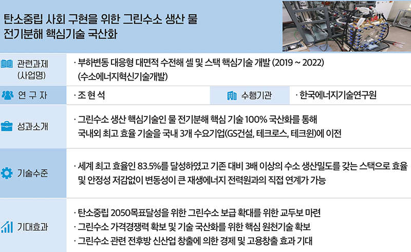 ‘탄소중립 사회 구현을 위한 그린수소 생산 물 전기분해 핵심기술 국산화(조현석, 한국에너지기술연구원)’는 기존 기술 대비 3배 이상의 수소 생산밀도를 갖게 하는 세계 최고 수준의 효율을 가진 물 전기분해 기술을 국산화하고 GS건설, 테크로스, 테크윈 등 주요 수요기업에 기술이전을 했다.