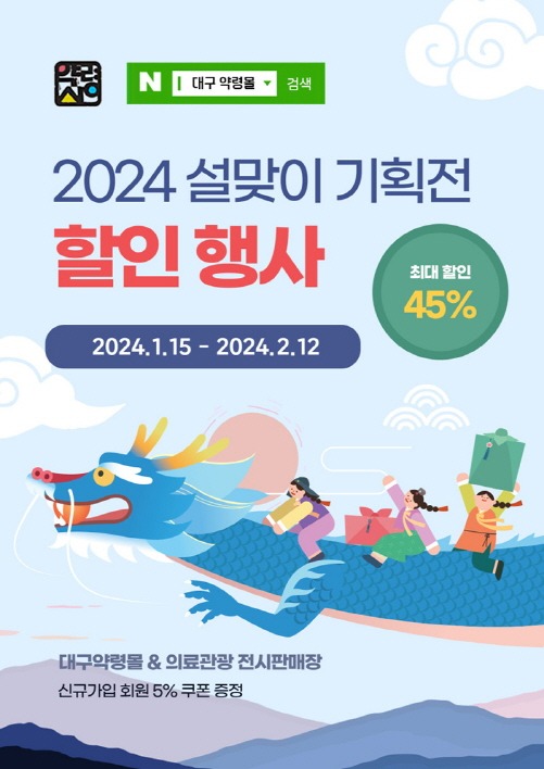 대구약령몰에서는 설맞이 기획전 5% 할인쿠폰을 제공한다. 또한, 기간 내 회원가입 시 신규회원에게 중복적용이 가능한 5% 할인쿠폰을 추가로 제공한다. 구매 문의는 고객센터(053-254-1951)로 하면 된다.