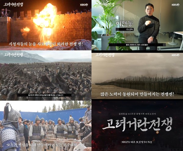 뿐만 아니라 런닝타임만 무려 30분에 해당하는 귀주대첩 촬영 장면도 일부 공개된다. ‘고려거란전쟁’을 위해 특별히 제작된 야외 크로마 세트장에서 촬영된 귀주대첩 씬은 대한민국 드라마 사상 최초라 자부할 수 있을 정도로 대규모 병력 묘사는 물론 지형 높낮이까지 CG로 만드는 등 더욱 사실감 있는 장면으로 완성됐다.