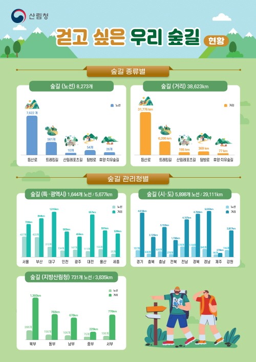 그 결과, 지난해 말 기준 전국에 조성된 숲길은 8,273개 노선 총 길이는 38,623km에 달하는 것으로 조사됐다.