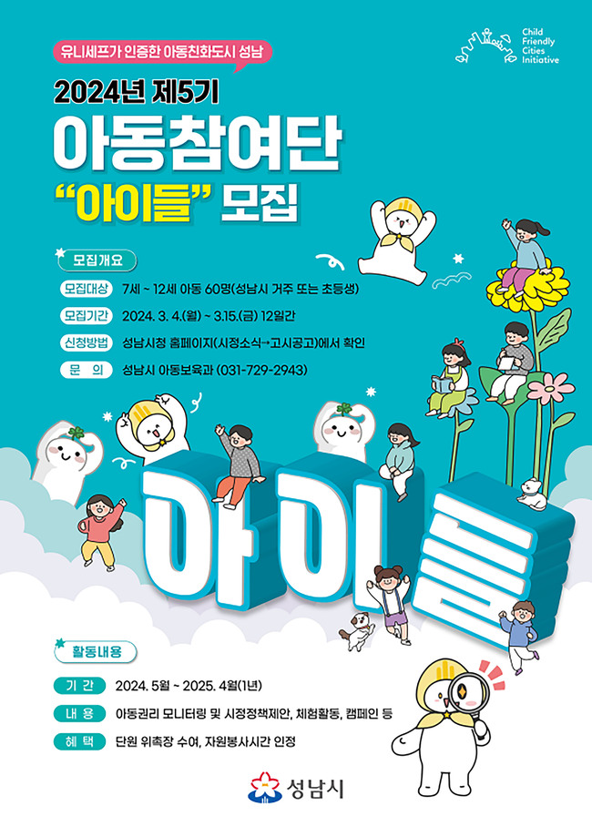 성남시는 오는 3 월 15 일까지 ‘ 제 5 기 아동참여단 ’ 으로 활동할 60 명의 단원 ( 아이들 ) 을 모집한다 .