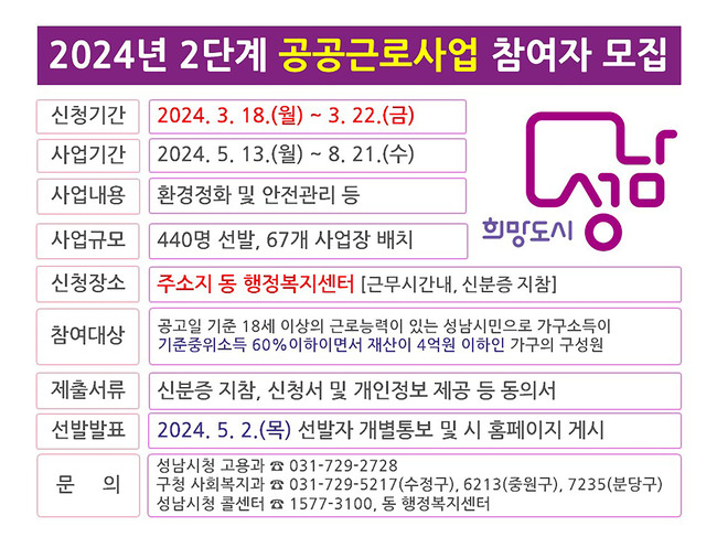 성남시는 오는 18 일부터 22 일까지 ‘2024 년도 2 단계 공공근로사업 ’ 참여 희망자 440 명을 모집한다 .