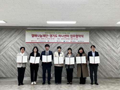 북한이탈주민의 안정적인 정착지원을 위해 경기도 하나센터 6개소(동부, 서부, 남부, 북부, 서북부, 중부)와 열매나눔재단이 경기도 북부청사에서 업무협약을 체결했다.