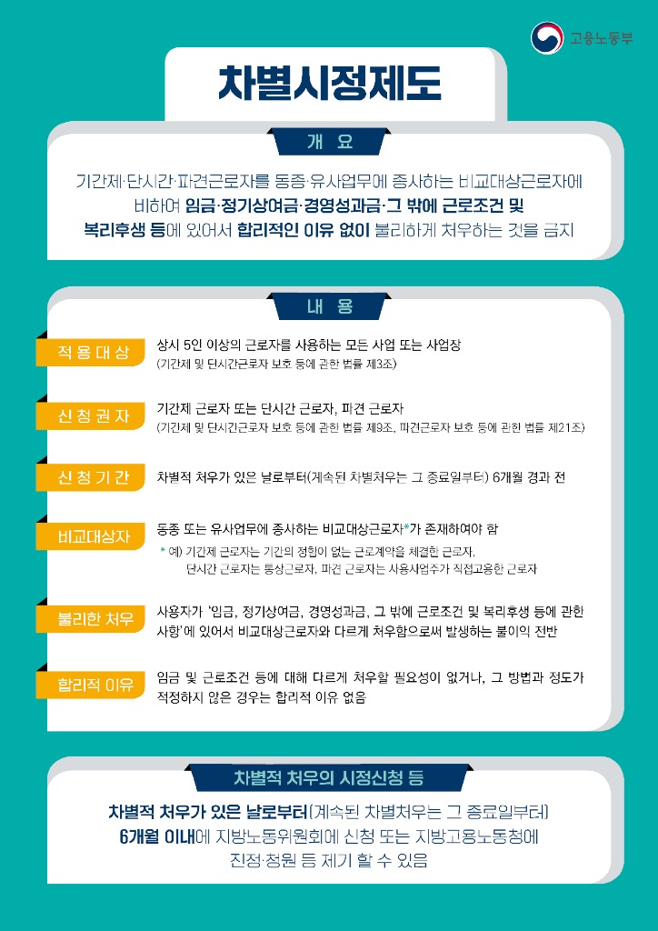 차별적 처우 관련하여 비정규직근로자가 동종·유사업무에 종사하는 정규직근로자와 비교하여 다음과 같은 불합리한 차별을 받는 사례가 있었다.