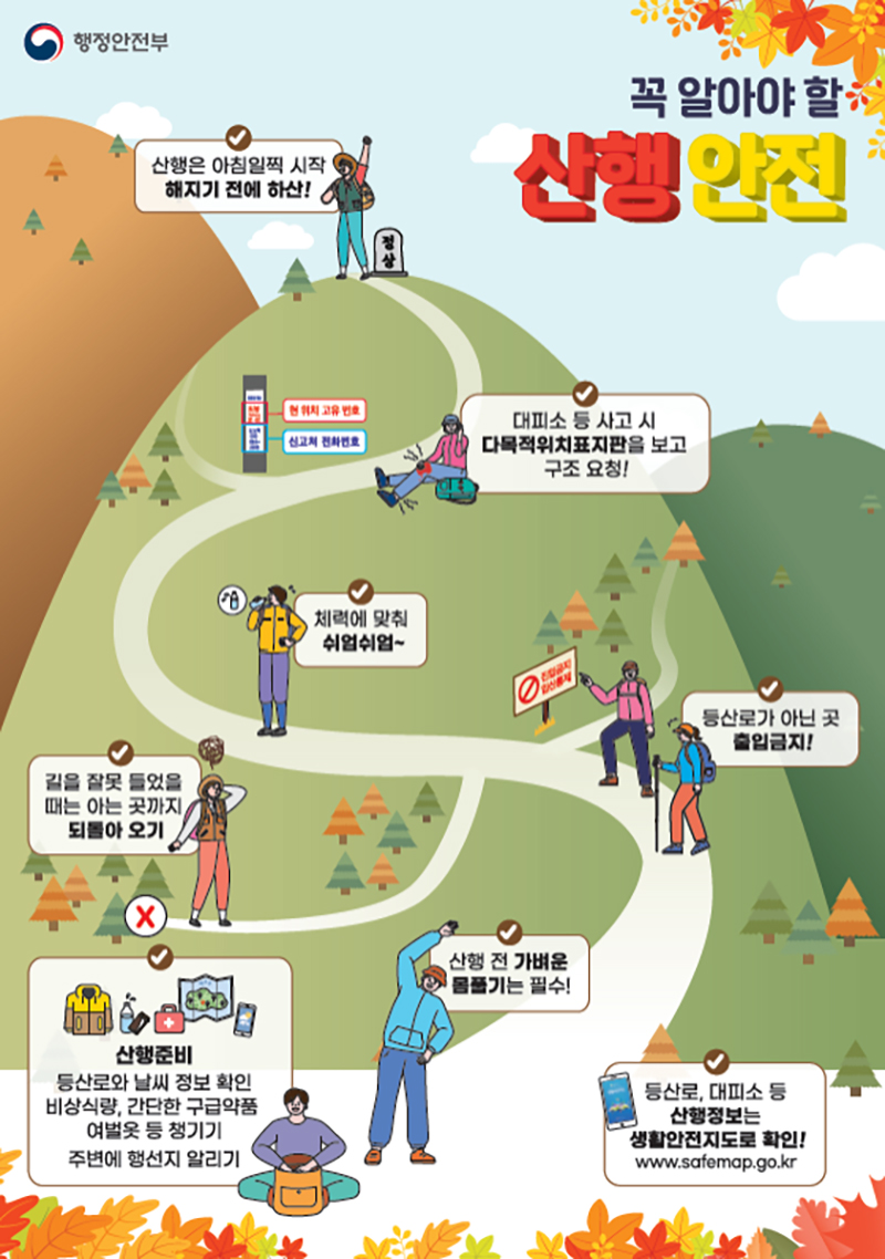 박명균 행안부 예방정책국장은 “봄철의 등산길은 일교차가 크고 서리 등으로 미끄러지기 쉬워 위험하니 안전한 산행을 위해 보온에 유의하고 안전수칙을 사전에 숙지하기 바란다”고 당부했다.