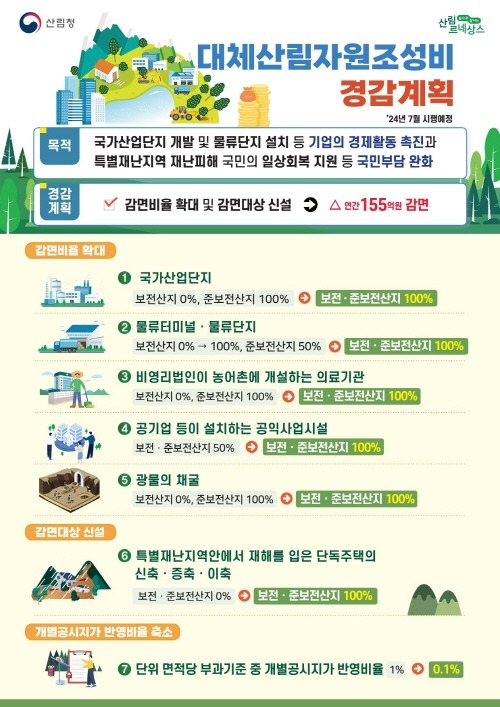 - 7월부터 국가산단, 물류단지, 재해피해주택 신축 등 대체산림자원조성비 감면