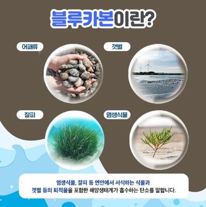 블루카본(Blue Carbon)이란 염생식물, 갯벌 등 해양생태계가 흡수하는 탄소를 뜻하는 말로 육상생태계보다 최대 50배 이상 탄소흡수 속도가 빠르고 탄소 저장에도 용이해 지구온난화 등 기후 위기에도 적극적으로 대응할 수 있어 그 중요성이 더욱 부각되고 있다.
