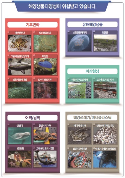 ‘해양생물다양성’은 해양생태계 내 생물종 및 생물체의 다양성 뿐만 아니라 생물의 서식지와 생태계의 다양성을 포함하는 것으로, 식량공급이나 기후조절, 생태관광 등 다양한 해양생태계 서비스를 공급하며 우리의 삶에 큰 영향을 미치고 있다.