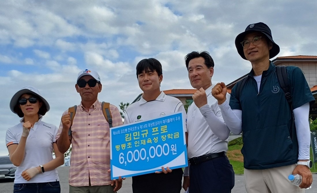 한국남자프로골프(KPGA) 투어에서 활약하고 있는 프로골퍼 김민규 선수가 7일 모교인 평동초등학교에 인재육성 장학금을 전달했다.