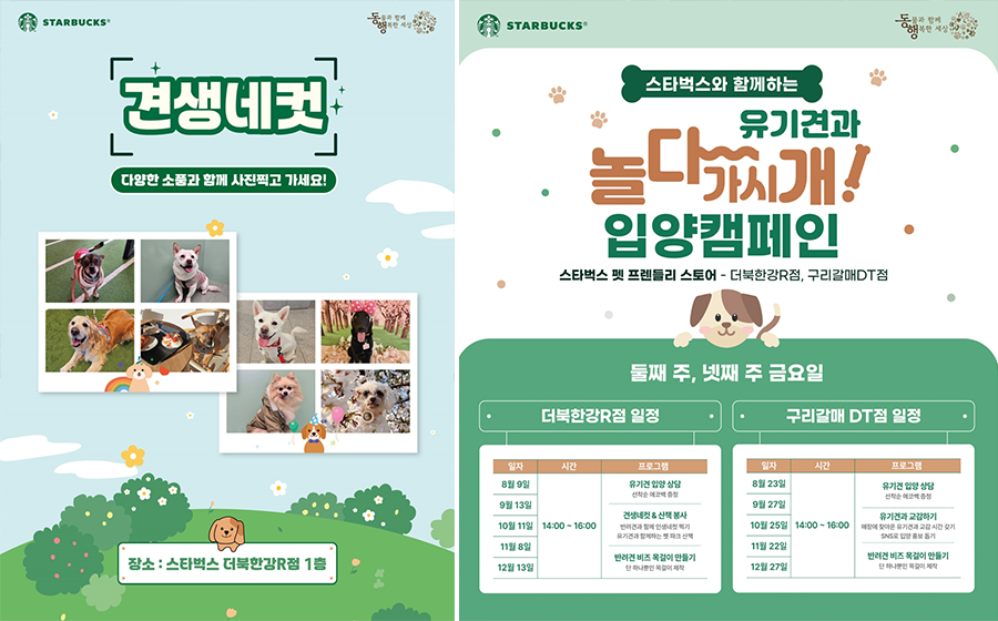 이 밖에도 스타벅스는 더북한강R점과 구리갈매DT점에 행사일 유기견 입양 상담 부스를 열고 유기견 입양에 대한 일대일 상담, 반려견을 위한 비즈 목걸이 만들기 체험 등을 진행하며 캠페인을 이어갈 예정이다.