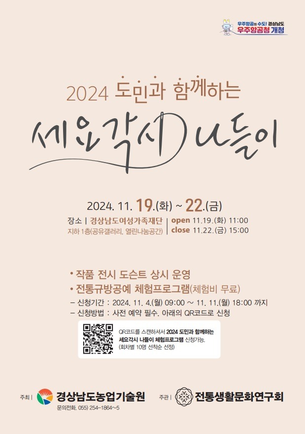 규방공예 체험프로그램은 사전 예약제로 운영되며 선착순 모집한다. 신청은 11월 4일부터 11일까지 경상남도농업기술원 홈페이지 공지사항에서 QR 코드 스캔하여 신청할 수 있다.