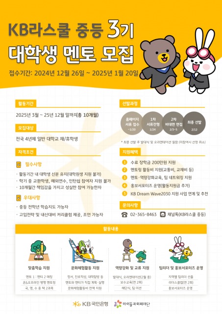 ‘KB라스쿨 중등’ 2025년도 프로그램에 참여를 희망하는 청소년 멘티 및 대학생 멘토는 KB라스쿨 홈페이지를 통해 모집 공고와 지원 방법을 확인할 수 있다.