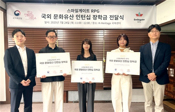 국가유산청 한국전통문화대학교는 스마일게이트 RPG와 손잡고 ‘국외 문화유산 인턴십 장학금’ 프로그램을 통해 총 3명의 학생을 해외 문화유산 전문기관에 파견한다. 지난 7월 24일 오전 11시 K-Heritage 국제센터에서 진행된 장학금 전달식에서는 총 1천만 원의 장학금이 학생들에게 지급됐다.
